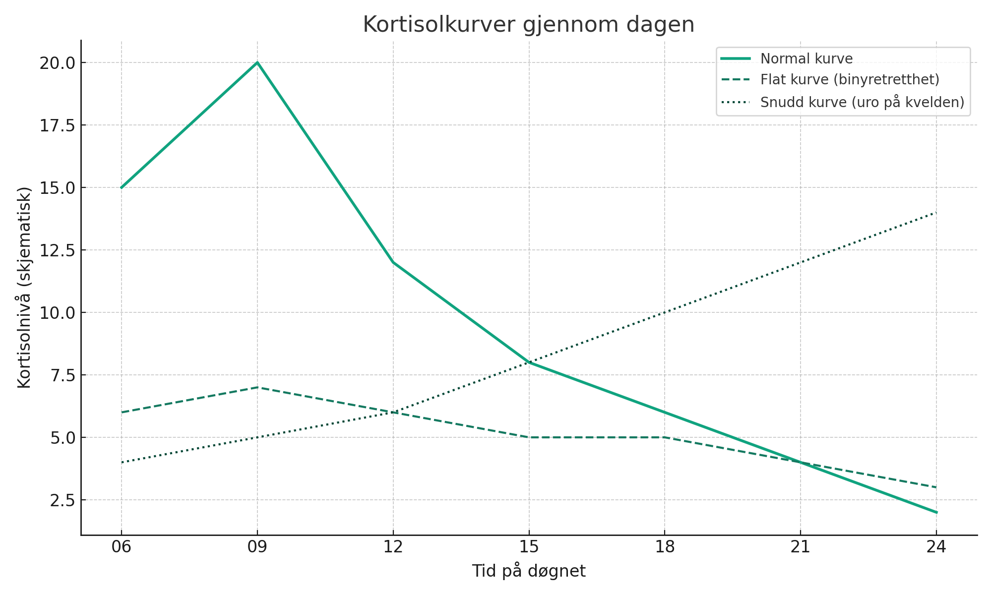 Kortisolkurven beskriver hvordan nivåene skal være høye om morgenen og lavere utover dagen. Dette gir naturlig energi og rytme.
